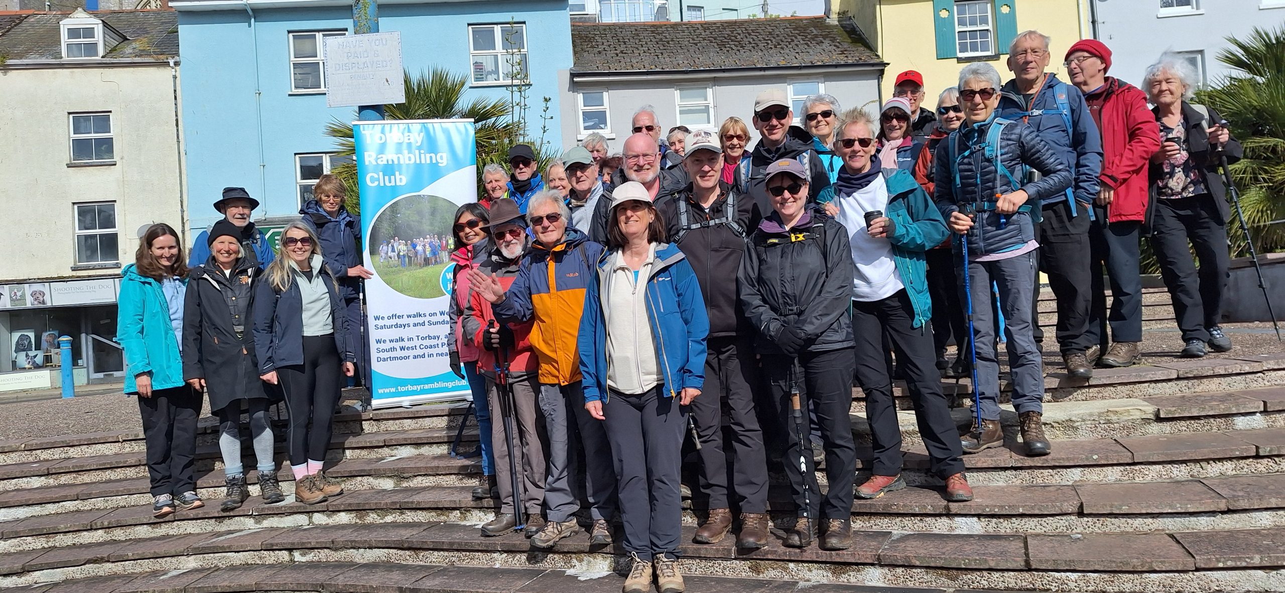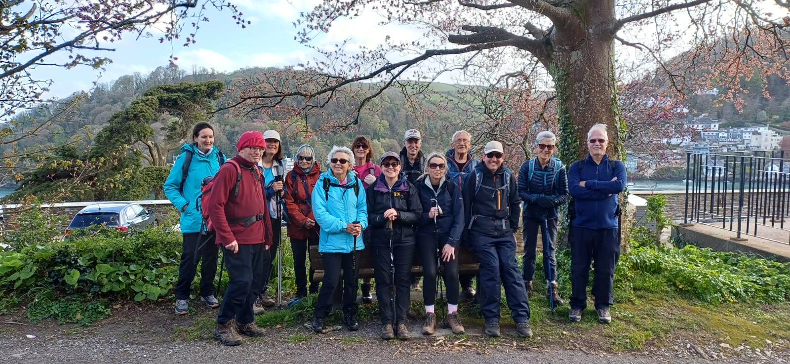 On Saturday 11th April 2026 thirty walkers gathered in Brixham Town Square for Torbay Rambling Club’s Anniversary Walk, postponed from October last year. The Club, one of the oldest rambling clubs in the country, was formed in 1950. In 2025 there were various celebrations for the 75th anniversary, including a summer party, a boat trip, a canoe adventure, a cream tea and the unveiling of a plaque in the Royal Terrace Gardens, Torquay by Torbay MP Steve Darling. When it came to the walk to commemorate the Club’s inaugural walk from Brixham to Kingswear, however, a named storm forced its postponement to Spring 2026.