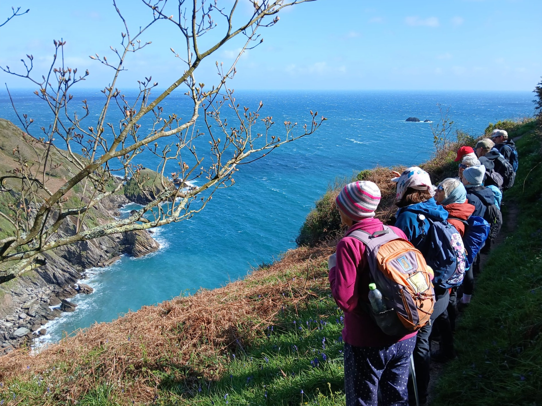 This time the weather was kinder, though rain, hail and strong winds, as well as bright sunshine, were experienced along the way. The group took the coast path to Berry Head, where walkers separated into two groups, those intending to walk the coast path to Kingswear and those preferring a shorter, less strenuous walk, turning inland at Sharkham and returning to Brixham. Both groups completed their walks successfully, with 14 walkers doing the full 11 miles to Kingswear.